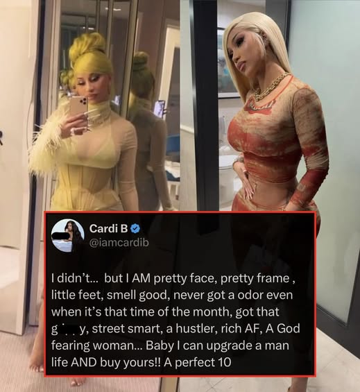 Cardi B has once again turned the internet upside down with a fiery declaration that fans are calling both empowering and controversial. In a recent outburst, she proclaimed: “I didn’t… but I AM pretty face, pretty frame, little feet, smell good, never got a odor even when it’s that time of the month, got that g. y, street smart, a hustler, rich AF, a God-fearing woman… Baby, I can upgrade a man’s life AND buy yours!! A perfect 10.”