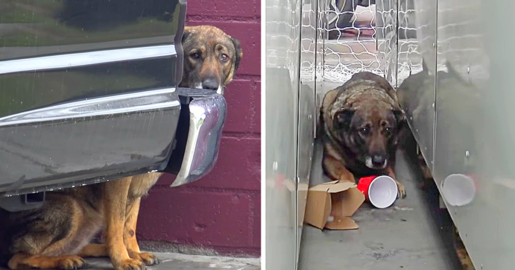 Entre los rincones fríos del metal y el asfalto, este perro busca desaparecer. Su cuerpo tiembla, su hocico apenas asoma entre las sombras, y sus ojos —esos ojos llenos de vida alguna vez— ahora reflejan solo miedo y cansancio.